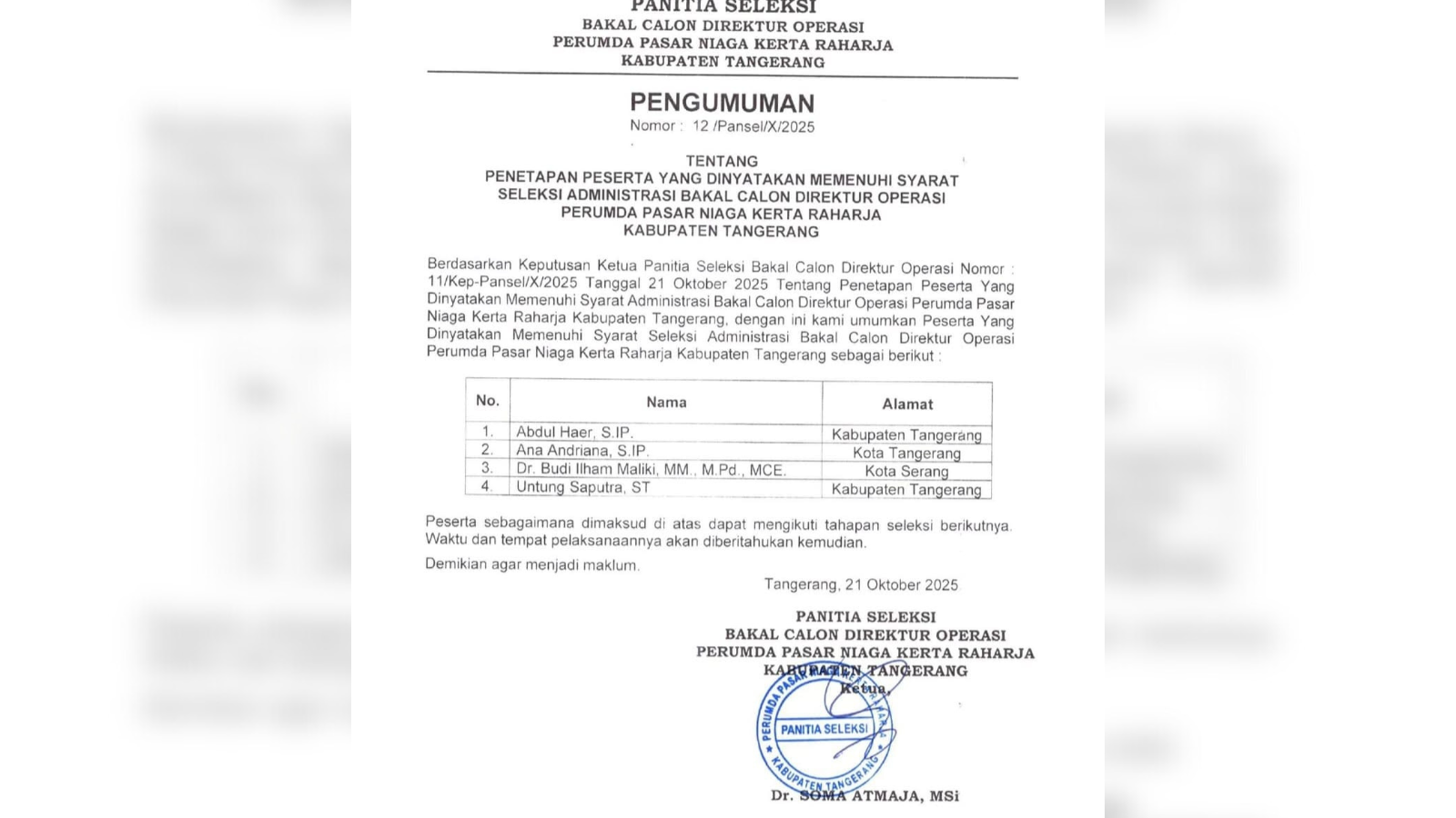Pengumuman bernomor: 12/Pansel/X/2025 tentang penetapan peserta yang dinyatakan memenuhi syarat seleksi administrasi itu ditandatangani langsung oleh Soma Atmaja selaku ketua.