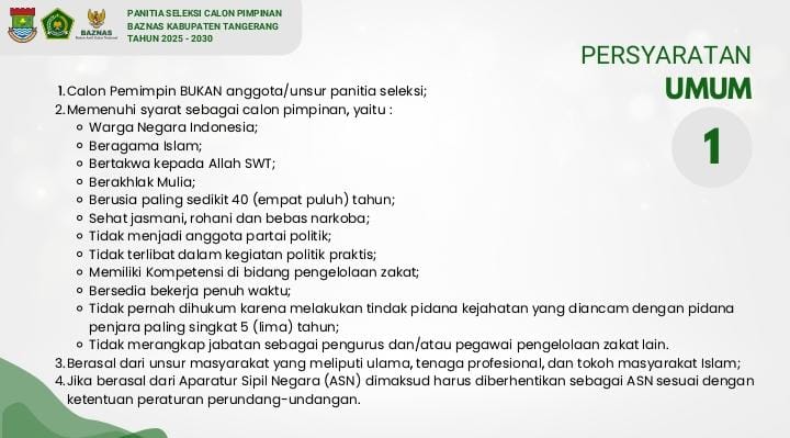 Ia menambahkan, terkait persyaratan untuk menjadi pimpinan Baznas Kabupaten Tangerang secara umum tidak ada yang berubah seperti tahun sebelumnya.